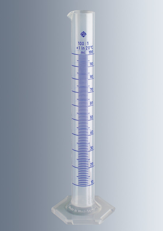 Graduated cylinders , plastic , ISO 6706 , with spout and hexagonal base , autoclavable