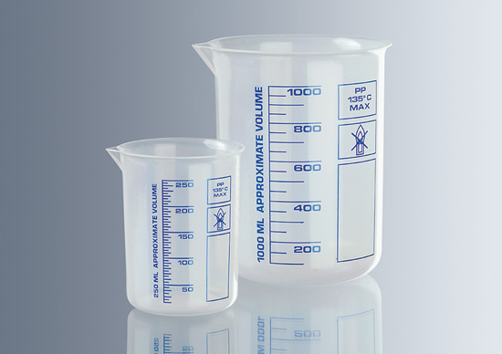 Beakers , plastic , low form , with spout , autoclavable , blue graduation